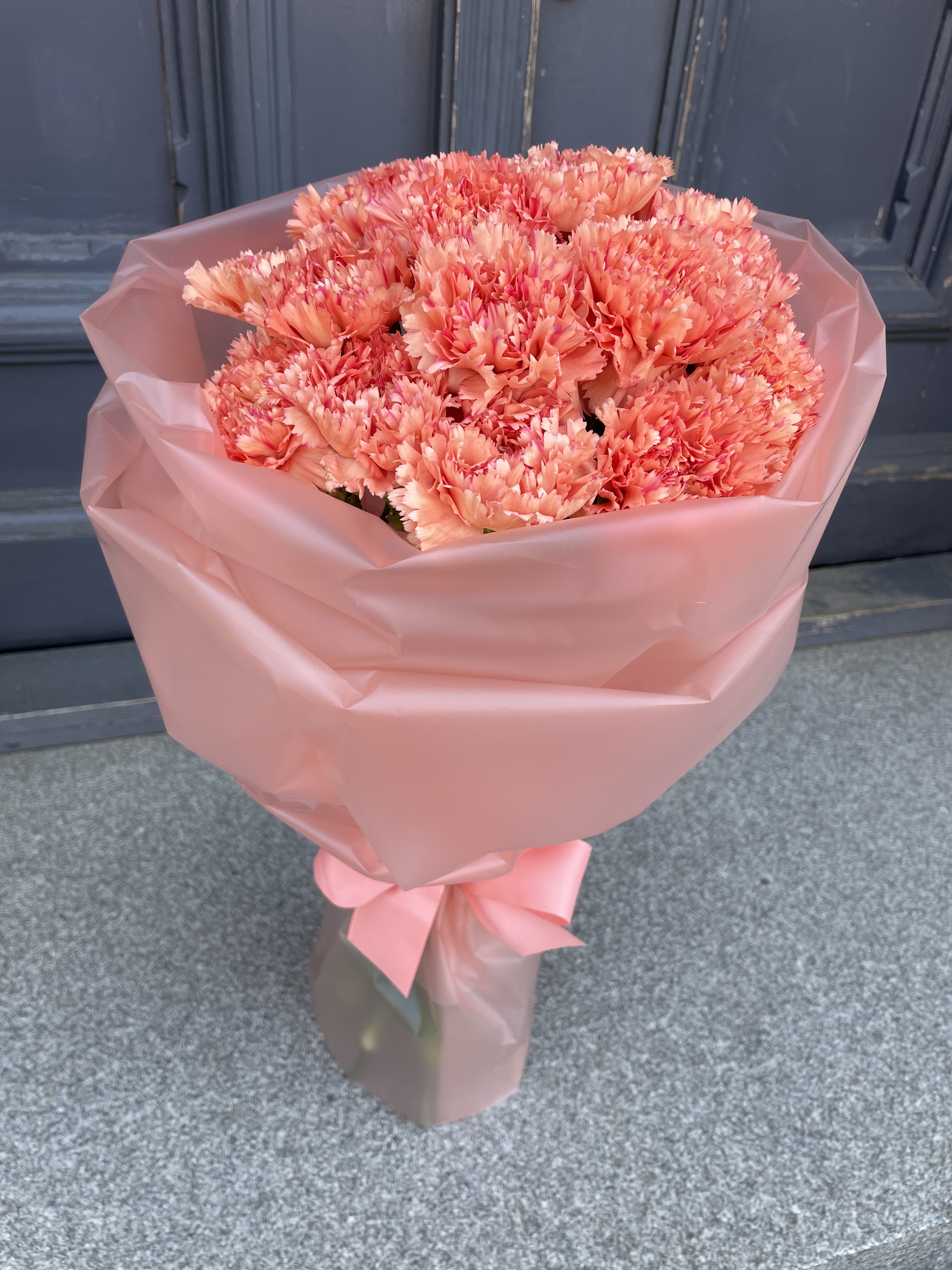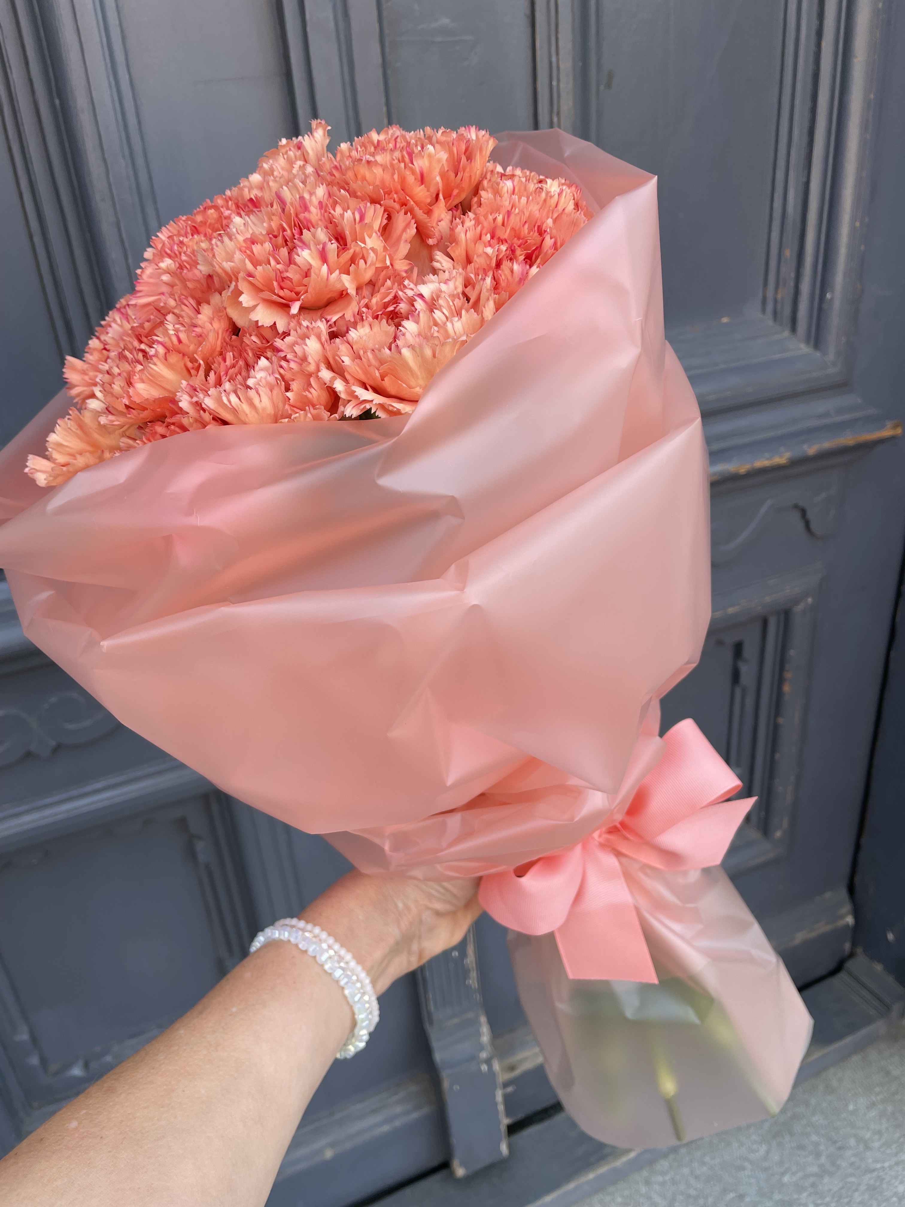 BUKIET GOŹDZIKÓW OWINIĘTYCH MATOWYM WODOODPORNYM PAPIEREM